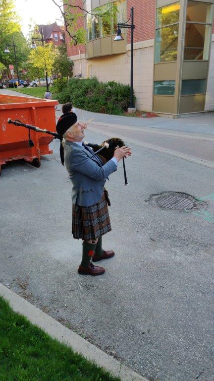 Here are a few photos from these two special events (click to see larger views). Rory Gus Sinclair leads the way as piper, followed at proper distances by several dozen neighbours. On the first walk, two fine horses and their police-officer riders joined the march.